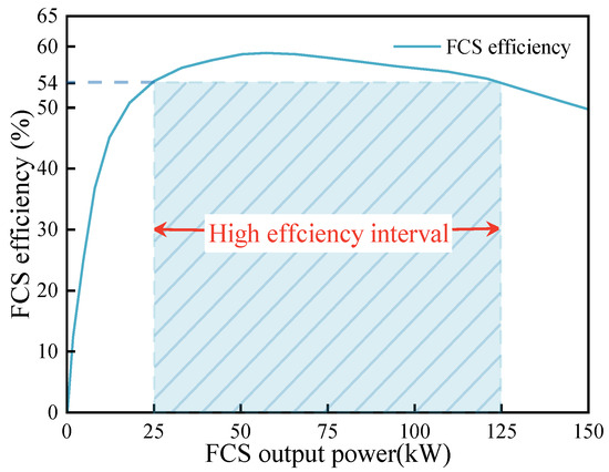 where is the total output power of the D-FCS, and Pfc is the net output power of each FCS. The efficiency of the FCS depends on its output power. Figure 2 illustrates the relationship between the efficiency of a single FCS and its output power. The FCS operates most efficiently within the power range of [25 kW, 125 kW]. The FCS fuel consumption can be calculated from the fuel cell system efficiency curve [35].