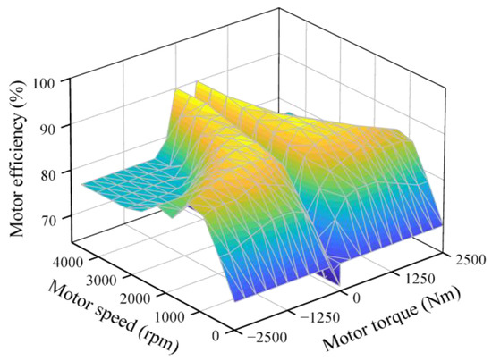 The drive motor of the FCHMT in this paper has a peak power of 600 kW, a maximum torque of 2500 Nm, and a top speed of 4500 r/min. The efficiency of the motor can be represented as a function of the torque and speed . Figure 3 shows the relationship between motor efficiency and torque and speed.