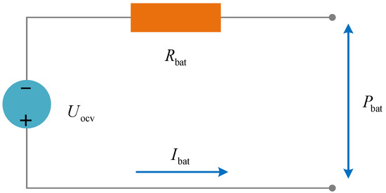 The use of lithium ion batteries as an auxiliary power source for FCHMTs not only supplements the vehicle’s peak power demand and mitigates fuel cell power fluctuations but also aids in braking energy recovery, thereby increasing the fuel cell system efficiency and extending its service life. This study uses the commonly applied equivalent internal resistance (Rint) battery model, depicted in Figure 4. The battery is represented by an equivalent circuit model, which includes an ideal voltage source and an equivalent series resistance. The electrochemical power and power loss of the battery are defined as follows: