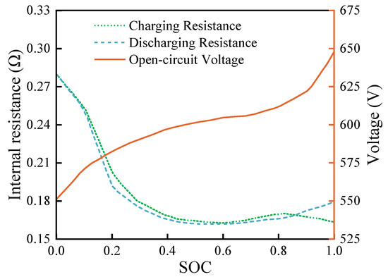 where , , and are the controllable power output from the battery storage system, the electrochemical battery power (or the ideal voltage source power), and the power loss within the battery system, respectively. UL and are the battery output voltage and open-circuit voltage, respectively. is the battery system output current, which is positive during discharging and negative during charging. is the battery’s internal resistance. The variation curves of the battery internal resistance and open-circuit voltage with respect to the SOC are illustrated in Figure 5. Consequently, the battery current can be calculated thus: