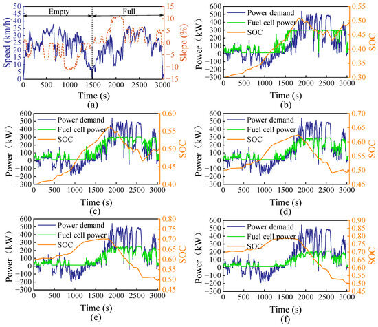 To explore the optimal energy allocation law of the FCHMT under varying power demands and SOC states, the DP algorithm is employed to solve the optimal energy allocation sequence. Different initial SOC values, = [0.3, 0.4, 0.5, 0.6, 0.7], are used as variables, with the target SOC set to 0.5. Figure 8a illustrates the speed trajectory and gradient under typical driving conditions of a mining truck [43]. Figure 8b–f illustrates the optimal DP-based fuel cell power output results under different initial SOC.