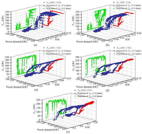 The distribution of fuel cell power scatter results solved by DP under different initial SOC: (a) Initial SOC = 0.3, (b) Initial SOC = 0.4, (c) Initial SOC = 0.5, (d) Initial SOC = 0.6, (e) Initial SOC = 0.7.