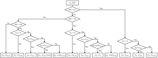 where is the fuel cell output power reference interval (in the above special cases, it is a fixed value). This rule implies that the fuel cell output power is maintained at 12.5 kW when the battery SOC is between 0.3 and 0.4 and when the required power is less than 0. By analogy, rules can be systematically extracted and sequentially applied from the data derived from the dynamic programming (DP) solution. It is important to note that the implicit rules within the database may not encompass all scenarios. Therefore, for these uncovered cases, linear extrapolation is employed to formulate rules. The rules derived from optimal theoretical analysis and extraction are presented in Table 4 and Table 5.