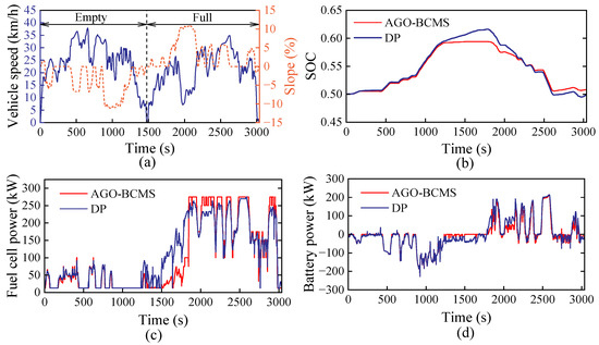 - The proposed AGO-BCMS-based EMS is validated through simulations under typical mining conditions, including unloaded downhill and fully loaded uphill operations. Compared with DP-based, ECMS-based, and rule-based energy management systems, the proposed strategy demonstrates superior performance in comprehensive operating cost control.