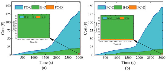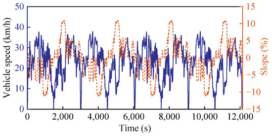 The comprehensive driving cost serves as a key indicator for assessing the effectiveness of energy management strategies. In this study, simulations under continuous operational scenarios are performed to investigate the dynamic changes in cost factors associated with the operation of fuel cell hybrid mining trucks. The continuous operational conditions consist of two sets of distinct operational data, alternating in four cycles, as illustrated in the Figure 15.