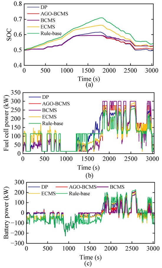 Since frequent start–stop conditions can severely degrade the lifespan of the fuel cell, it is reasonable to set a minimum power limit for the fuel cell. In this paper, the minimum power point is set to 12.5 kW. and are the minimum battery and fuel cell powers, respectively. and are the maximum battery and fuel cell power changes per unit time, respectively. is the final value of the SOC, and is the target SOC value.
