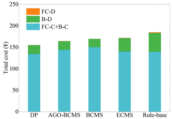 From the composition of the total operating cost shown in Figure 14, it is evident that battery degradation cost significantly impacts the total operating cost. Due to the constraint of approximate global optimal rules, the proposed strategy exhibits global optimization characteristics close to DP, considering battery degradation cost globally to ensure balanced optimization of all costs. The battery degradation costs for the proposed strategy and DP are CNY 20.8438 and CNY 20.0115, respectively, while the battery degradation costs for BCMS, ECMS and rule-based strategies are CNY 19.2022, CNY 31.3106 and CNY 44.1090. Compared to ECMS and rule-based strategies, the proposed strategy reduces battery degradation cost by CNY 11.1956 and CNY 23.9940, respectively. This is mainly due to the optimization of multi-objective cost balancing. The proposed strategy exhibits a slightly higher battery degradation cost compared to the BCMS, as it suppresses the output of the fuel cell, leading to increased battery usage.