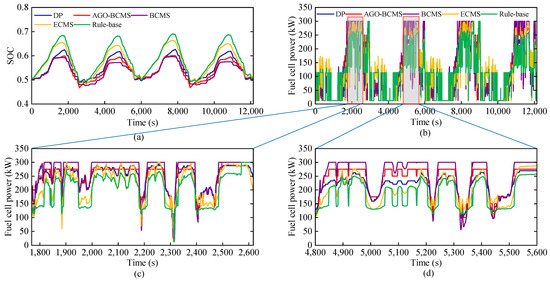 Comparison of AGO-BCMS strategies and various strategies under operating condition 2: (a) Battery SOC trajectory comparison; (b) fuel cell output power comparison; (c) comparison of fuel cell output power at 1800–2600 s; (d) comparison of fuel cell output power at 4800–5600 s.