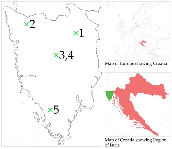 The Croatian part of the Istrian peninsula is located in the western part of Croatia, covers an area of 2813 km2, and has a population of 195,237 (2021 census) [55]. The Istrian peninsula has always been suitable for settlement because it is located at the crossroads of the West and the East, the North, and the South of Europe. Over the millennia, Istria has changed owners and states, from the Roman Empire, through Byzantium, the Frankish and Venetian Republics, the Austro-Hungarian Empire, and Yugoslavia, to the Republic of Croatia today [56]. Istria is among the most developed Croatian regions and is particularly known for its tourism, gastronomy, and processing industry [57].