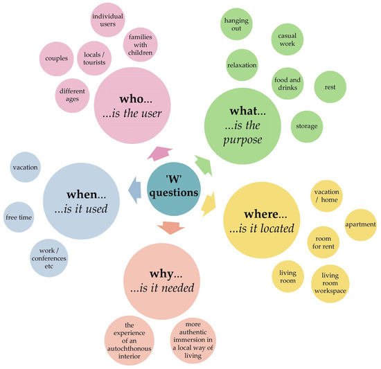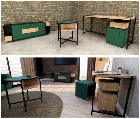 To meet the user’s needs for newly designed furniture, it was also necessary to analyze the space and purpose of the most frequently used room in the accommodation—the living room. The living room is considered an (indoor) space in which people, since time immemorial, spend their free time, relaxing and socializing with other family members [92]. As today’s generations mix their “free time” with “work time” using a laptop or computer, connecting the dining room and living room for the purpose of socializing, working, and resting, it is necessary to design appropriate furniture solutions that will provide enough space for storing, resting, dining, working, etc. Therefore, living rooms often have to satisfy different conditions, such as relaxation, entertainment, socializing, dining, or work, or to accommodate this incongruous combination of “quiet” and “noisy” activities [93,94].