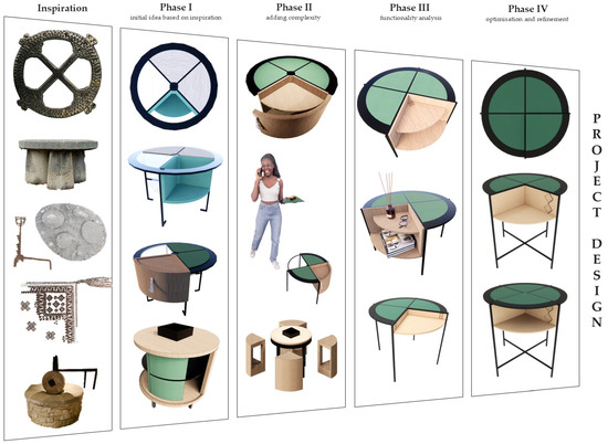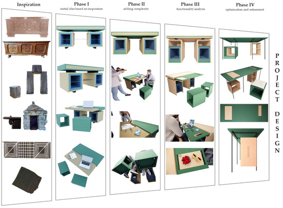 In the process of research and design, the cyclical method of the creative process was used [87] with the application of other literature on design theory and creative process design [88,89,90,91].