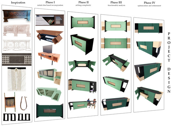 The route of the creative process of designing conceptual solutions for the living room furniture collection for accommodation intended for tourist purposes is presented (Figure 3, Figure 4 and Figure 5). The process conceptually began with the design of the work table, the possible connection of a mobile chair as an integral part of the working table, a coffee table with a portable tray, and a chest of drawers/commode. The process of conceptualization begins with inspiration and continues with the creation of conceptual solutions through phase I—an initial idea based on inspiration; II—difficulty and complication in the creative process; III—functionality analysis; IV—optimization and refinement, up to the performance solutions shown in Section 3.7.