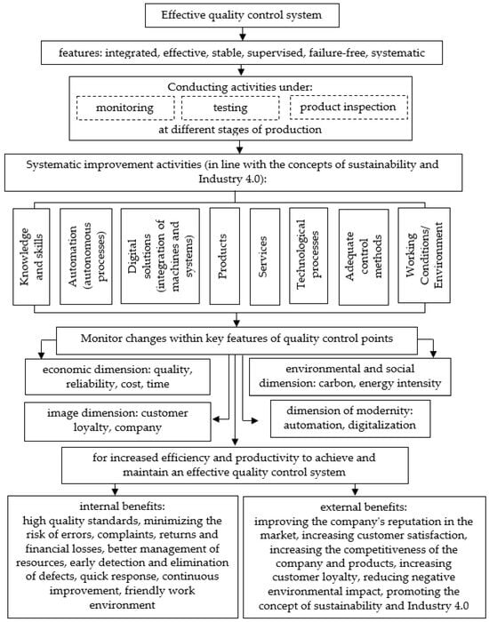 Based on the analysis and consideration of the literature on the subject and with reference to the identified research gaps, a model for the implementation and maintenance of an effective quality control system for cast-aluminium alloy products was developed. The originality aspect of the presented model manifests itself in the presented course of action, which leads to multifaceted indicator analyses of quality control and its improvement. The model subjected to indicator analysis a number of key features (for manufacturing companies and the environment) of quality control points, which relate to four main dimensions: the economic dimension (efficiency, reliability, cost, and time), environmental and social dimension (emissivity and energy intensity), modernity dimension (automation and digitisation), and image dimension (customer loyalty and company competitiveness). At the same time, the main premise of the diagnosis and subsequent improvement is to take care of the implementation of improvement activities in accordance with the concept of sustainable development and in the direction of Industry 4.0 (smart factory). A detailed analysis of quality control is a translation of microscale activities that have a significant impact while simultaneously ensuring the appropriate level of quality of the products offered, taking care of the pro-environmental nature of the product and the activities implemented, with improvements closely related to automation and digitisation. The presented multifaceted activities show the superiority of the developed model over the classical approach to quality control, which mostly deals with the analysis of product non-conformities alone or the implications of new quality control methods. Extended analyses make it possible to determine the total efficiency of individual quality control points and develop an improvement strategy that simultaneously ensures the quality stability of products, reduces the negative impact of detection on the environment, and introduces full automation and digitisation of detection. The presented model fills the research gaps detected in the literature on building systems for effective quality control of production processes in the context of the implications of the ideas of sustainable development and Industry 4.0.