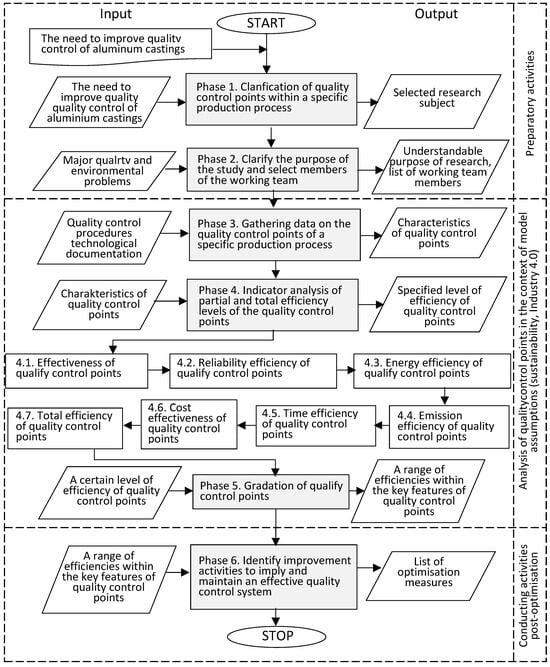 A sequential algorithm was used to build the flowchart, in which the start of the next activity must be preceded by the completion of the previous one. The algorithm considers three main stages: preparatory activities, analysis of quality control points in the context of the model’s assumptions (sustainability, Industry 4.0), and maintenance and improvement. Within the three stages, the key activities of the implementation procedure and their inputs and outputs are identified (Figure 2).