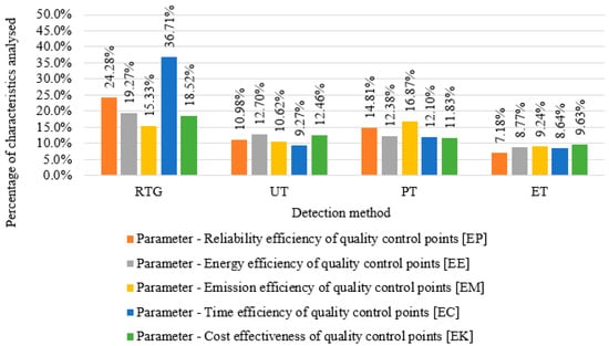 Cost effectiveness is another important aspect of shaping an effective and efficient quality control system. According to Table 5, the RTG method is a relatively expensive method due to the need for complex apparatus and consumables, which, combined with the high level of efficiency of the method, generated a parameter value of 18.52%. Detection with examination of the UT method had the lowest cost, but due to the significant level of efficiency of the method, it reached a value 2.57% higher than the ET method.