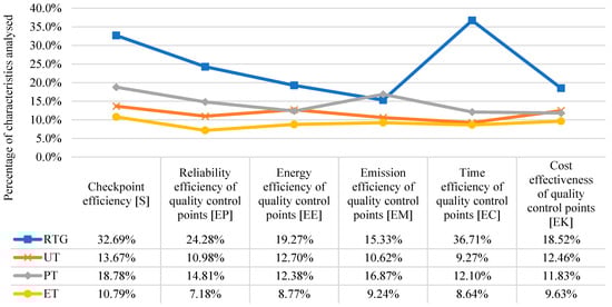 The assumptions of the developed model indicate that within the characterisation of NDT methods used in quality control, it is also necessary to determine their most important features from the company’s point of view: frequency of detection method within the production process, frequency of identification of nonconformities within the production process, failures of detection machines and equipment, energy intensity of unit detection, emissivity of unit detection (chemicals, waste, and pollutants), time of unit detection, and cost of unit detection (Table 3). The frequency of a detection method indicates how often a specific detection method is used within the control system of a specific product. The frequency parameter indicates how often defects are detected in a product using a specific detection method. Failures of machines and detection equipment indicates the level of failure of equipment used for inspection with a specific method. The energy intensity informs about the level of electricity consumption during the detection of a single piece of product by a specific NDT method. The emissivity of a unit detection is a parameter that tells about the ability of a given detection method to emit chemicals, waste, and pollutants during a unit detection. The values of the indicators of detection unit time and detection unit cost inform about the time of realisation of a single test and their costs. The detection methods indicated in Table 3 are carried out within the quality control system of a specific product, and therefore, their values within individual characteristics are equal to 100%. The values in percentage terms illustrate the distribution of the magnitude of the individual parameters within a specific quality control system using the following detection methods: RTG, UT, PT, and ET.