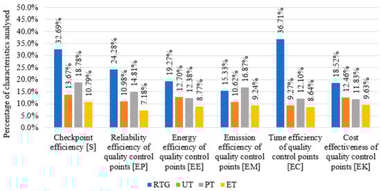 The energy efficiency level of the quality control point in which the RTG method was used was the highest (Table 5). Despite the high energy consumption for the test unit and the impact of the other relevant efficiency parameters (frequency of detection method and frequency of identification of nonconformities), the energy efficiency of this method showed a more than 6.5% advantage over the UT and PT methods and 10.67% over the ET method. The identified relationship confirms the reasonableness of the costs associated with the implementation of RTG testing.