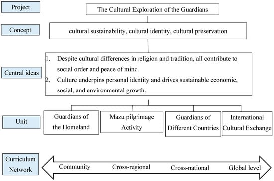 Erickson et al. (2017) [33] pointed out that concept-based theory is a framework focused on curriculum design and learning processes, emphasizing the organization of course content around “concepts” as the core. This approach helps learners focus on the relationships between factual content, identify the essential nature underlying concepts, derive broader principles (generalizations) from details, establish abstract cognitive frameworks, and apply them in diverse contexts. ‘The Cultural Exploration of the Guardians’ curriculum framework (Figure 1) is no longer based on factual knowledge. Instead, it is concept-based and expands the curriculum network by adding two more units: ‘Guardians of Different Countries’ and ‘International Cultural Exchange’. The curriculum network, originally focused on family and community, expanded its geographical scope to include neighboring countries like Japan’s Central Tokyo, Thailand’s and Burma’s Songkran Festival, and Western Christmas, allowing for cross-cultural comparisons. This expansion helps students explore the impact of religion on culture and collective consciousness, ultimately enabling them to better appreciate the uniqueness of their own culture. Finally, the curriculum challenges students to introduce their culture to friends from other countries, utilizing a perspective based on intangible cultural heritage.