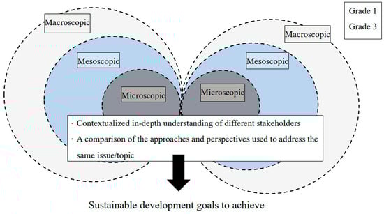 Localizing SDGs is important for ensuring that SDGs are effectively implemented. It requires adjusting and adapting implementation plans for SDGs based on the specific cultural, economic, and environmental characteristics of a location (UNESCO, 2017) [40]. Localization strategies are important for promoting ESD because they not only increase students’ sense of social responsibility but also enable students to experience and promote sustainable development in their daily lives (Tilbury, 2011) [41]. Thus, all three levels of the curriculum network—micro (individual, family, community), meso (cross-regional), and macro (international and global)—are essential.