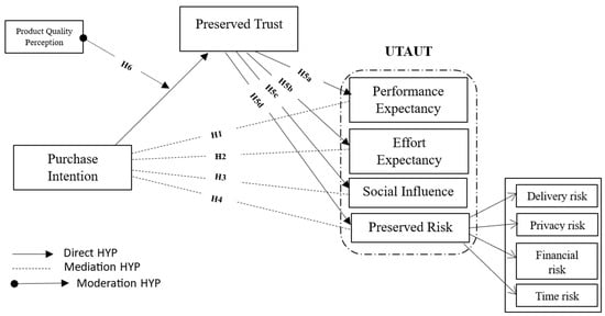The traditional UTAUT model could not succeed in adding psychological elements, such as perceived risk [26], and demographic characteristics, such as gender and age [27]. Our study enhances the original conceptual framework of UTAUT within the framework of digital e-commerce channels. We define “perceived risk” as the independent variable, “perceived trust” to be a mediator, and “product quality perception” to be a moderator. The model identifies purchase intention as a dependent variable, while controlling for consumers’ demographic characteristics. The Unified Theory of Acceptance and Use of Technology (UTAUT) is a model that was developed by researchers [22] to explain how users intend to utilize an information system and apply it [11]. Since the introduction of UTAUT, it has been subjected to empirical testing and has been validated as an advanced theory that can describe the behavior of online shoppers [28]. The UTAUT model is particularly well-suited for this study because it provides a comprehensive model to understand and predict individual behavior in the adoption and use of technology.