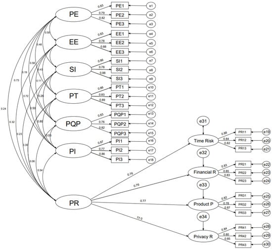 In our study, ten dimensions were used, performance expectancy (Pe), effort expectancy (Ee), social influence (Si), perceived trust (Pt), product quality perception (PQp), purchase intention (Pi), perceived risk (Pr), time risk (Tr), financial risk (Fr), and preserved risk (Pr). A total of 30 measurement themes were assessed. As mentioned in Figure 2, a CFA model is completed through AMOS 23.0. For fitting confirmation, we loaded data into SPSS25.0 and positioned variables consistently in the AMOS 23.0 measurement model. Table 4 displays the outcomes of the model fitting. The CMIN/DF was 2.078 < 3. The adjusted goodness-of-fit index, non-normative fit index, comparison fit index, and normative fit index all reached or exceeded 0.9. The root mean square of the difference was 0.029 < 0.08. The estimated error was 0.016 < 0.08 of the root mean square. Overall, each model fit index aligns with the requirements. Table 5 shows the summary of the results of AMOS 23 and the output of average variance extracted and composite reliability.
