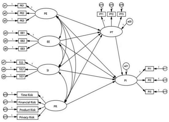 Before conducting the empirical study, we developed a model including the structural equation and measurement model. First, it is crucial to define the role of each variable and its interrelationships with the others. Our research identifies six main variables: PE, EE, SI, PR, PT, and PI. Figure 2 shows the theoretical framework.