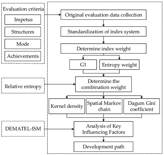 - Development structure. New structural economics emphasizes that an economy’s endowment and its structure will adjust with different levels of development, and it is necessary to take into account the structural characteristics of different development stages. These characteristics are determined by the element endowment structure and its derived competitiveness [24]. Based on this, industrial structure and trade structure are chosen as indicators to measure development structure. Industrial structure is composed of the proportion of the tertiary industry and advanced industrial structure. The trade structure includes the openness of foreign investment and the openness of foreign trade.