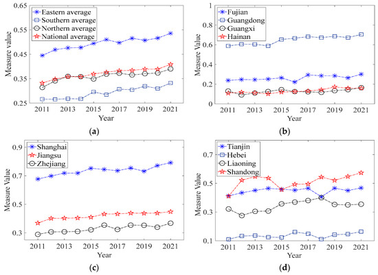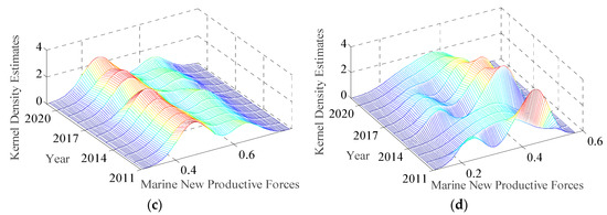 - There is regional heterogeneity in the downward trend of intra-regional variation among the three marine economic circles. Figure 4d illustrates the evolution of the intra-regional variation in the three regions over the sample period, with the northern and southern intra-regional variation exhibiting a trend of decreasing waviness. The largest decrease in intra-regional variation was observed in the southern region, followed by the northern region, while the eastern region showed a small increase in intra-regional variation. Intra-regional variations in the southern region are consistently the largest of the three regions, suggesting a higher degree of imbalance in the development of marine new productive forces among the southern provinces. For example, Guangdong’s level of marine new productive forces in 2021 was 0.7046, while Hainan’s score in the same year was only 0.1592, a significant development gap between the two. It is worth noting that the intra-regional variation in the eastern region is more volatile, with a trend of “rapidly rising—rapidly falling—slowly rising” throughout the sample period.