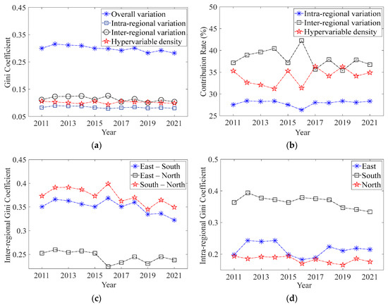 (a) Evolution of the overall Gini coefficient and its decomposition. (b) Decomposition of Gini coefficient differences and their contribution rates. (c) Gini coefficient values by region. (d) Regional Gini coefficients.