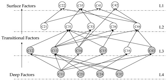 - According to Equations (27) and (28), we obtain the reachable set and the antecedent set , and determine the multi-layer hierarchical influence structure model, where X is the indicator set.