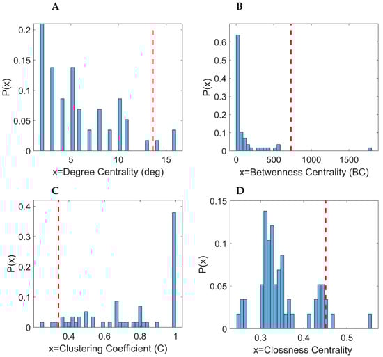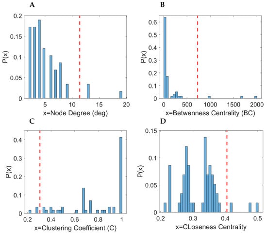 Distributions of the computed network measures. The red vertical line indicates the 95% percentile value of the distribution. (A) Degree centrality. (B) Betweenness centrality. (C) Clustering coefficient. (D) Closeness centrality.