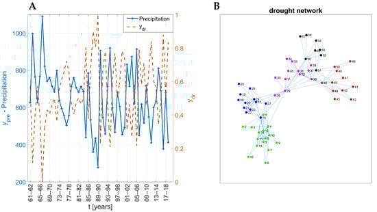 In this section, we apply the network construction and analysis for the data of the Florina area. Similar to the previous section, we transform the precipitation data into drought evolution using Equations (12) and (13); see Figure 7A. The resulting drought network of Florina is depicted in Figure 7B. The color code in Figure 3B shows different communities in the network.