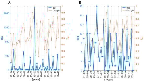 Similar results are obtained in Figure 4B (but not so clear compared to Figure 4A), e.g., the highest three maxima of degree centrality coincide with the three maxima of drought time series at the same positions as in betweenness centrality.