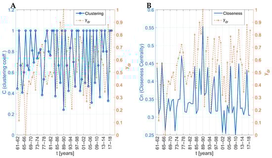 The betweenness centrality and the degree centrality for each node are presented in Figure 8A,B, respectively. Clearly, in Figure 8A, betweenness centrality BC admits one dominated maximum value, which appears together with a maximum value of . It is of interest that all other local maxima of BC in Figure 8A coincide with extreme drought values of and specifically the following years: 1964–1965, 1976–1977, 1989–1990, 2006–2007, 2011–2012, 2016–2017. These nodes are localized in the network as 4 → 1964–1965, 16 → 1976–1977, 29 → 1989–1990, 46 → 2006–2007, 51 → 2011–2012 and 56 → 2016–2017. A detailed view of the network structure in Figure 7B confirms that these nodes are the central hubs in the structure. Similarly, in Figure 8B, the degree centrality follows the drought , i.e., the local maxima coincide with the local maxima of drought time series (however, not so clear compared to Figure 8A).