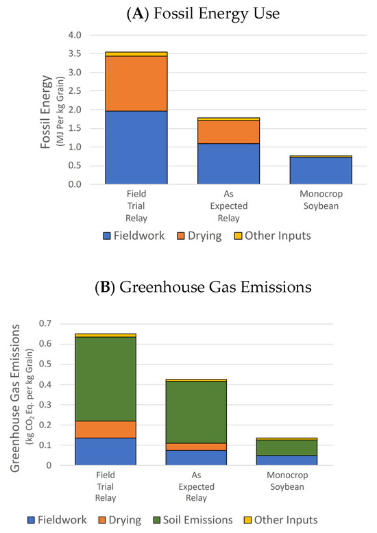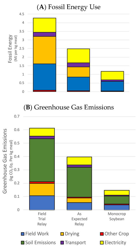 As this is an exploratory LCA, the findings are meant to provide a starting point for the range of the environmental impacts that are expected for an organic relay camelina system. As additional data become available, models should be updated to provide more accurate evaluations of environmental impacts. Several areas were noted that should be more closely examined in further work. Notably, the high camelina grain moisture observed in our relay cropping trial resulted in added GHG and fossil energy impacts. Further research could help identify a likely long-term average for relay crop harvest moistures.