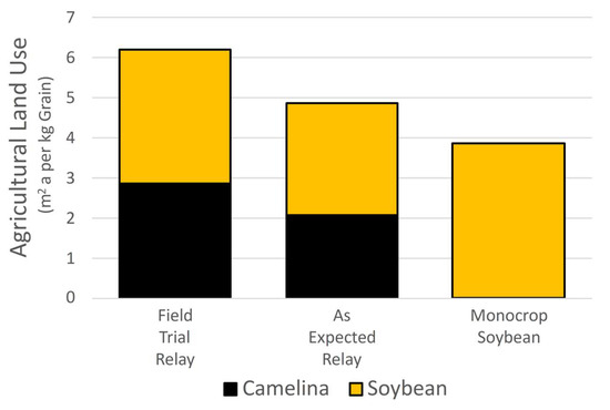It is likely that genetic and agronomic advancements in camelina production and its companion soybean crop will increase total grain yields in future relay cropping systems. Sensitivity analysis on crop yields supports the suggestion that increases in yield can reduce environmental impacts to levels below those of monocrop soybeans. Given time, this could result in another sustainable protein option for use in swine diets.
