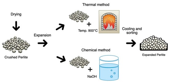 The production of expanded perlite begins with the crushing and drying of raw perlite ore. The material is first crushed into smaller particles to prepare it for the expansion process, and then it is dried to remove any surface moisture. After drying, the perlite can be expanded using one of two primary methods: the thermal method or the chemical method. In the thermal expansion method, the crushed perlite is heated in a furnace to a temperature of approximately 900 °C. At this high temperature, the trapped water within the perlite rapidly vaporizes, causing the material to expand up to 20 times its original volume. This sudden expansion creates a lightweight and porous structure that characterizes expanded perlite. Alternatively, in the chemical expansion method, the perlite is treated with sodium hydroxide (NaOH), although this approach is less common and is typically used to achieve specific properties in the expanded perlite. Following expansion, the material undergoes a cooling and sorting process. Once cooled, the expanded perlite is sorted by particle size, making it ready for use in various applications. Expanded perlite is valued for its lightweight, insulating, and fire-resistant properties, which make it suitable for uses such as construction materials, insulation, and filtration [15,16,17].