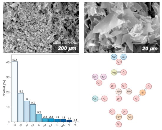 Figure 3 provides detailed insights into the microstructure and chemical composition of expanded perlite, highlighting the unique properties that contribute to its effectiveness in various applications. The two microscopic images in Figure 3 at the top illustrate the porous and flaky structure of expanded perlite at different magnifications (200 µm and 20 µm). These microstructures reveal the high porosity and irregular surfaces of expanded perlite, which are essential for its low bulk density and excellent insulation properties. The high porosity also increases the surface area, making perlite suitable for applications such as filtration and soil aeration.