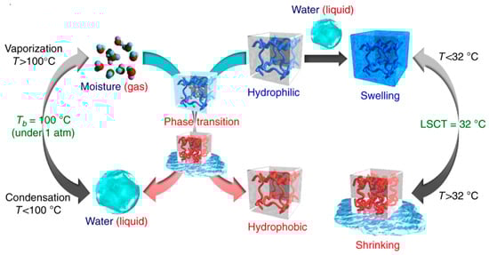 - Matsumoto, K.; Sakikawa, N.; Miyata, T. Thermo-responsive gels that absorb moisture and ooze water. Nat. Commun. 2018, 9, 2315. [Google Scholar] [CrossRef] [PubMed]