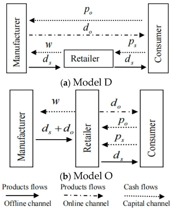 The relationship between variables and parameters is reflected in the linear demand functions. In general, assume and . Market demand and other pertinent information are symmetrically available to all game players. Notably, distinct channel strategies are employed by supply chain participants. Figure 2 shows the channel structure, with Figure 2a showing manufacturer’s dual-channel strategy and Figure 2b showing retailer’s dual-channel strategy.