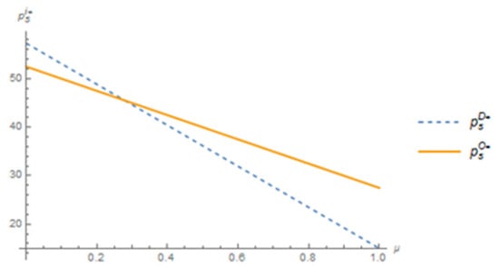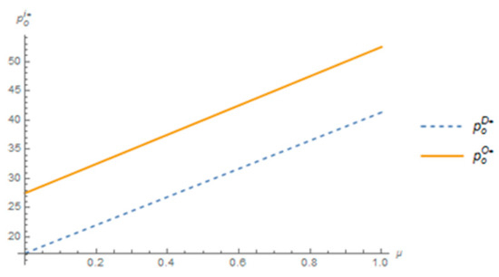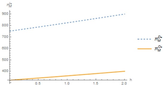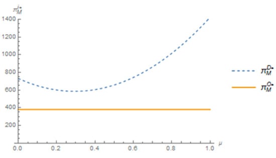It reveals that the relationship between online and offline retail prices is affected by potential market size (). The decision-maker should decide the channel selection strategies according to the size of the market. The findings reveal that in smaller market sizes, the online and offline retail prices within model D are comparatively lower than those in model O. Conversely, when the market size surpasses a specific threshold, both online and offline retail prices in model D become higher than those in model O. There are several managerial implications based on this conclusion. When the potential market scale exceeds a certain range, the online direct selling price of manufacturers will be relatively high, and with consumers increasingly preferring online shopping, more profits will be generated. The analysis later in this article shows that the manufacturer’s profits in model D surpass those in model O. For retailers, model D only sells goods in offline brick-and-mortar stores. It is widely accepted that when the potential market scale () is relatively large, consumers’ need to enjoy service and the shopping experience leads to increased costs in physical stores, which makes the offline price in model D higher.