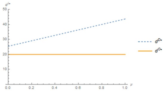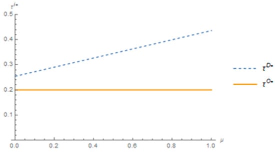 Due to the e-commerce background, retailers primarily focus on the preferences of online consumers. The proportion of online demand should be relatively large, so let . Keeping other parameter values unchanged. Independent variable is a range to show the trend of change on decision variables. The trend of change is shown in Figure 9, Figure 10, Figure 11 and Figure 12. Figure 9 depicts the trend of emission reduction in two scenarios. When increases, emission reduction rate increases linearly in two models. In other words, the cost of cutting emissions will rise for manufacturers, so in the long term this makes cutting emissions harder. Figure 10 demonstrates that the profits of the manufacturer are directly proportional to the unit carbon quota (). The higher the , the lower the investment cost to adopt green technologies. The manufacturer’s profit is consistently higher in Model D than in Model O. Economically speaking, adopting a dual-channel strategy is advantageous for a manufacturer’s sustainable management. Figure 11 describes the impact of variable on the level of environmental damage. Obviously, model O is greener than model D, i.e., model O is less environmentally damaging. The retailer’s dual-channel strategy is an environmentally friendly approach, yet it generates fewer economic benefits compared to the manufacturer. Consumers, however, are more inclined to choose model O. Figure 12 shows that social welfare is more favorable in model O compared to model D. What calls for special attention is that from a supply chain perspective, model D can not leave behind social welfare, i.e., . This is mainly due to the increased environmental pollution caused by model D. Thus, the following proposition is concluded: