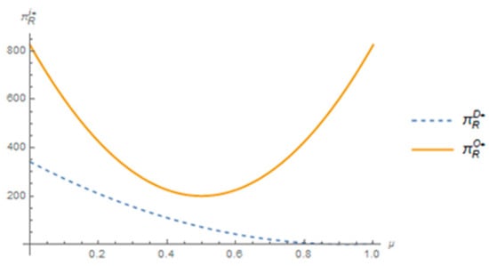The curves in Figure 8 illustrate the profit fluctuations for retailers. As the variable escalates, the retailer’s profits in model D gradually decline. However, in model O, the retailer’s profits initially diminish before progressively ascending. The retailer’s channel selection strategy has a certain impact on their business performance, which is subject to the channel sales strategy adopted by the manufacturer. This proposition reveals that the performance generated by the retailer’s multi-channel operation is more beneficial than just a single channel, which is consistent with common intuition. One can interpret this phenomenon concerning channel selection as follows: The dual-channel operation of downstream retailers enhances market competitiveness and reduces costs due to economies of scale, which hurts the profitability of upstream enterprises based on marketing principles. Broadly speaking, online and offline dual-channel operations produce more economic benefits than using a single channel.