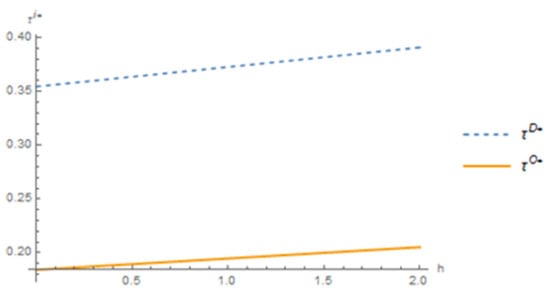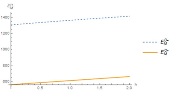This proposition indicates that both online and offline demand increases when increases, and they go down as goes up. The phenomenon shown in Proposition 6 is similar to those in Proposition 3. A higher unit carbon quota () leads to a lower production cost. Thus, the retailers’ selling price will go down, leading to an increase in online/offline demand, which is why the tendency of both and regarding is the same. Furthermore, the lower the initial unit carbon emissions (), the more environmentally-friendly the production process, the more online/offline demand, which is why the tendency of both and regarding is the opposite. Retailers should expand market demand in accordance with the manufacturer’s cap-and-trade regulations.
