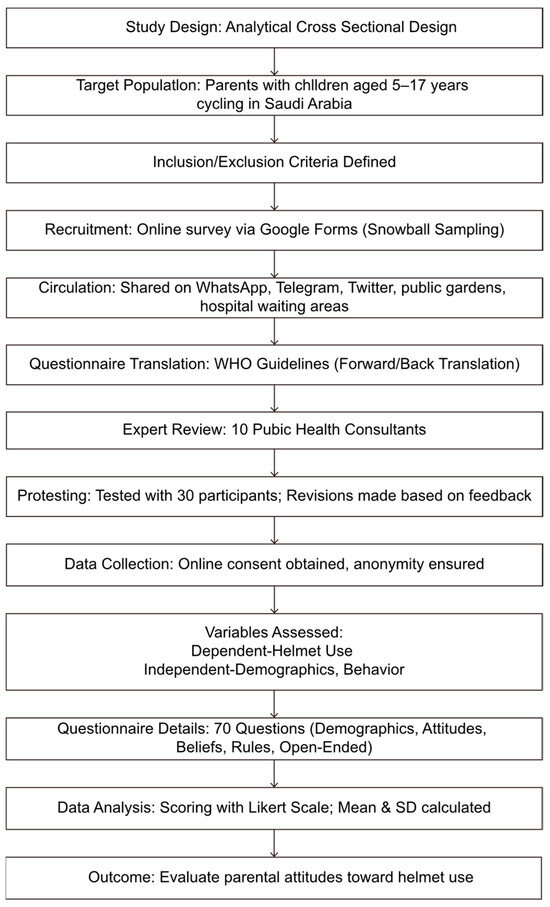The inclusion criteria were parents with one or more children aged 5–17 years who used a bicycle (bicycle, tricycle, quadricycle, and scooter), lived in Saudi Arabia, and resided with the child in the same home. The exclusion criteria included parents with ≥1 child not in the 5–17-year age group, who did not cycle, and who lived outside Saudi Arabia.