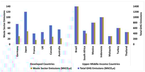 Globally, the open dumping of solid waste generates approximately 1.6 billion tons of CO2 equivalent annually, accounting for around 5% of global emissions, with the majority originating from decomposing food waste [6]. As illustrated in Figure 2, annual GHG emissions from developed countries (e.g., Germany, Japan, or Canada) and upper-middle-income countries (e.g., Brazil, Mexico, or South Africa) reveal important contrasts in waste sector contributions.