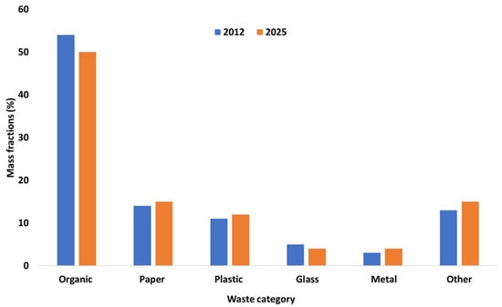 WARM requires detailed data on the input fractions of individual materials in the waste stream, which are influenced by several factors, including cultural practices, economic development, climate, and energy sources [36,37]. Variability and uncertainty in waste stream composition can significantly affect assessments related to global warming potential, nutrient enrichment, and human toxicity [38]. To minimize these uncertainties and achieve a consistent composition, this study used waste composition data for upper-middle-income countries, provided by the World Bank [39], for the years 2012 and 2025. This ensured a more accurate assessment of waste management strategies and their related environmental impacts.