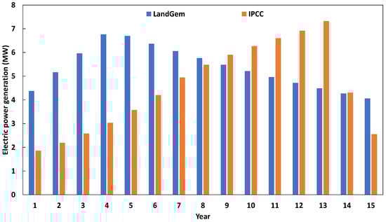 In Equation (11), is the annual methane generation in the year of the computation (m3/year), is the methane generation rate (year−1), which is set at 0.050, is the potential methane generation capacity, which is set at 170 m3/ton, is the mass of waste accepted in the ith year (ton), and represents the age of ith section of waste mass accepted in the ith year. The index is incremented from 1 to , where refers to the difference between the year of computation and the year of waste acceptance.