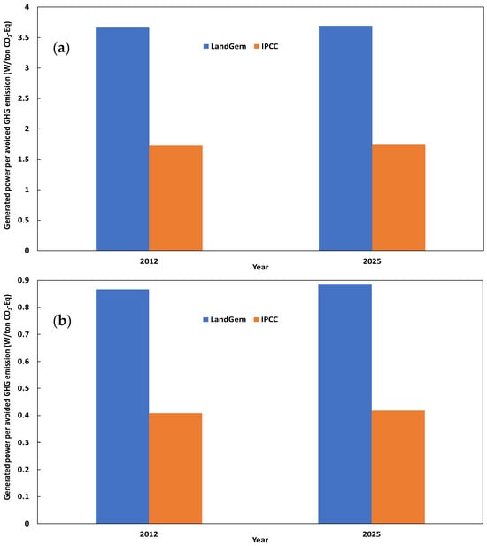 where is the GHG emission from the considered scenario expressed in tons, i.e., CO2-eq/ton waste, according to WARM, while represents the emissions based on the electric energy recovery scenario. is the electric power recovered per ton of waste based on the LandGem and IPCC models. This metric was computed according to two transformative approaches: (i) from uncontrolled landfilling to energy recovery and (ii) from landfill gases flaring to energy recovery.