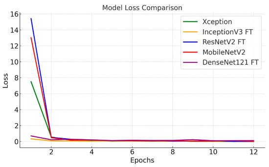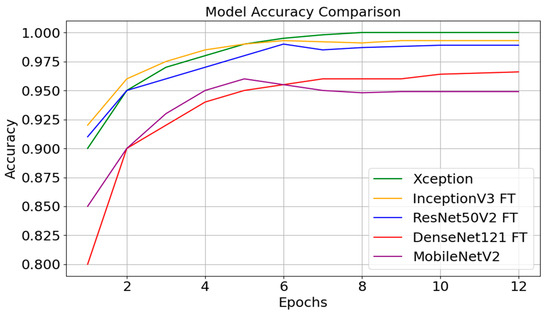 In contrast, the DenseNet121 (FT) and MobileNetV2 models showed comparatively lower performance, stabilizing around 94% and 92%, respectively. This suggests that these architectures may be less suitable for this specific task or may have required further hyperparameter tuning to optimize their performance. Their inability to reach the accuracy levels of Xception and InceptionV3 highlights limitations in extracting the critical features necessary for accurate classification in this dataset.